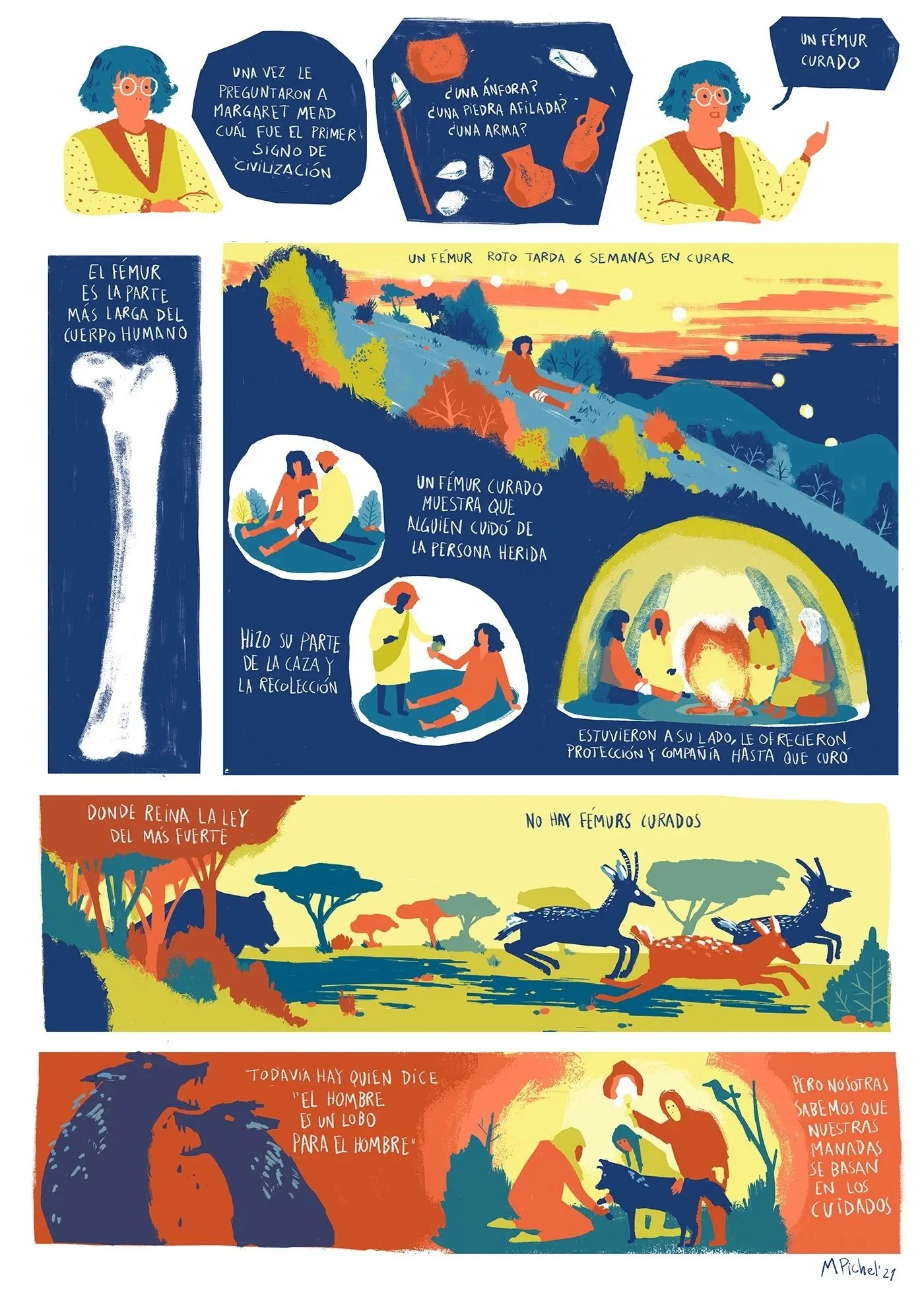 A collaboration for Femiñetas. Reflection from the anthropologist Margaret Mead about which was the first sign of civilization. She highlighted the importance about caring and community for the human species to develop.